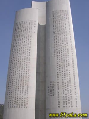 高40公尺的主碑 ,形如一把鋒利的刺刀 。主碑的三個(gè)面上,分別鐫刻著彭真、徐向前、薄一波的題詞。彭真的題詞是“戰(zhàn)績輝煌,永垂史冊(cè)”;徐向前的題詞是“參加百團(tuán)大戰(zhàn)的烈士們永垂不朽”;薄—波的題詞是“百團(tuán)大戰(zhàn),抗日戰(zhàn)爭中最光輝的一頁,必將載諸史冊(cè),永放光芒?!?/p>