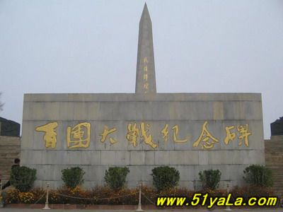 “百團(tuán)大戰(zhàn)紀(jì)念碑”座北朝南,由主碑、三座副碑、一座大型圓雕、兩座題字碑、四個(gè)烽火臺(tái)和長 227米蜿蜒起伏的長城組成,于1987年6月30日建成。