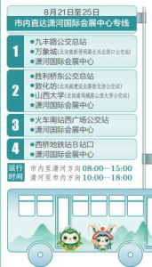 太原市將在山西文博會期間開通5條免費(fèi)公交接駁專線。其中,4條市內(nèi)直達(dá)瀟河國際會展中心的專線,分別從九豐路公交總站—萬象城(北向南新晉祠路長興北街口公交站)—瀟河國際會展中心;勝利橋東公交總站—敦化坊(北向南建設(shè)北路敦化坊公交站)—山西大學(xué)(北向南塢城路山西大學(xué)公交站)—瀟河國際會展中心;火車南站西廣場公交站—瀟河國際會展中心;西橋地鐵站B站口—瀟河國際會展中心。運(yùn)行時間為市內(nèi)至瀟河方向8:00—15:00,瀟河至市內(nèi)方向10:00—18:00。此外,為便于駕車自行前往的市民出行,還開通了1條社會停車場至山西瀟河國際會展中心的免費(fèi)接駁線路。該線路從先行路瀟河大街口經(jīng)先行路至?xí)怪行耐颠\(yùn)行,在智慧南街口、先行路樂商街口??浚\(yùn)行時間為9:00—18:00。