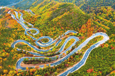 10月17日拍攝的左權(quán)縣太行龍泉風(fēng)景區(qū)景色。太行一號(hào)旅游公路北天池段,似長(zhǎng)龍盤旋在五彩斑斕的太行秋色之中,峰回路轉(zhuǎn),風(fēng)景秀麗,繪成一幅絕美的天然畫卷,帶領(lǐng)游客開啟詩意之旅。