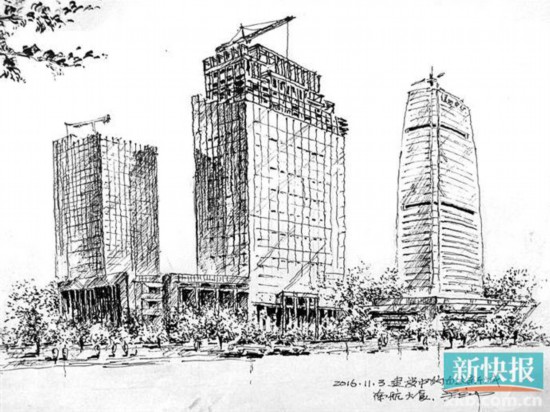 “以前工作日需要上班,我就利用周末在街巷間走動,看到地標建筑就開始畫。遇到正在施工的高樓,我就計算著日子,到高樓即將封頂的時候,我就帶上紙筆到施工現場畫畫?!眳橇⒅薪榻B。