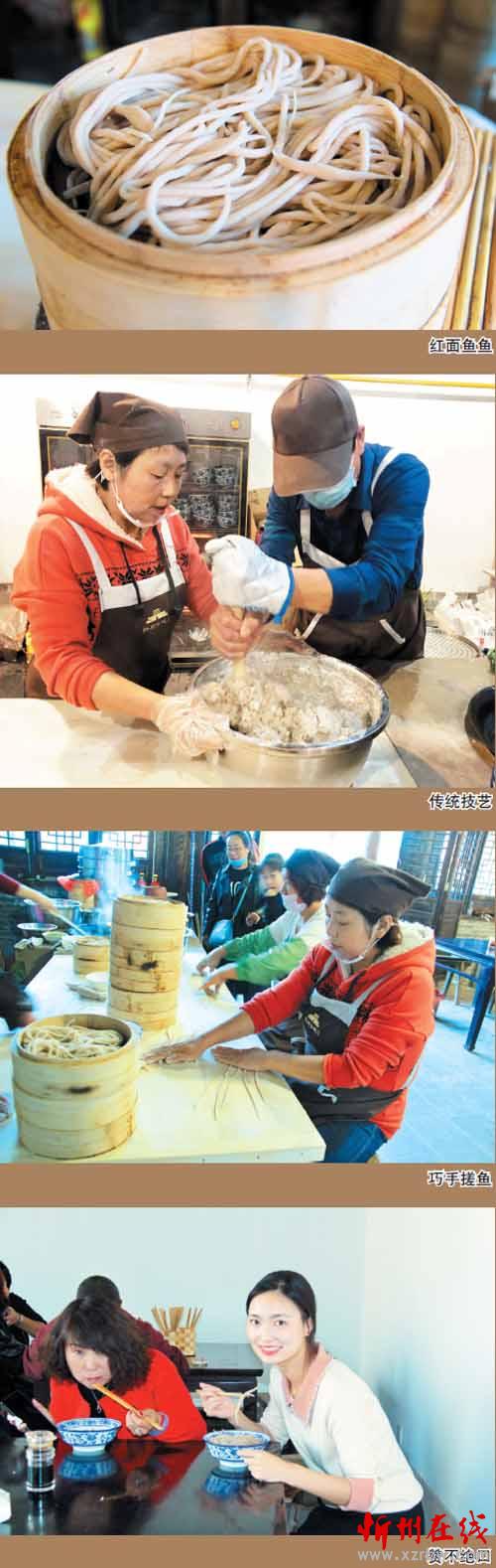 這家店的女主人叫康秀蘭,今年51歲,忻府區(qū)豆羅鎮(zhèn)韓溝村人。秀蘭從小勤快,幫助母親洗鍋?zhàn)鲲?,學(xué)搓魚魚。18歲時便遠(yuǎn)近聞名,掌握了搓魚魚的好手藝。在今年忻州古城招商比賽入圍的6家店鋪中,秀蘭的小店脫穎而出,奪得第一名,拿到了開門店的資格。眼下夫妻二人經(jīng)營著兩間大的門臉兒,小籠屜蒸魚魚,臊子有鮮肉蘑菇、西紅柿和老酸菜湯,食客們可根據(jù)自己的喜好選擇。他們兩口子既當(dāng)老板又是廚師。在食客多時臨時雇幾個幫工,小生意做得風(fēng)生水起??敌闾m告訴筆者,自開張以來食客不斷增加,國慶節(jié)假期期間一天的最高銷售紀(jì)錄是賣出200多籠紅面魚魚。