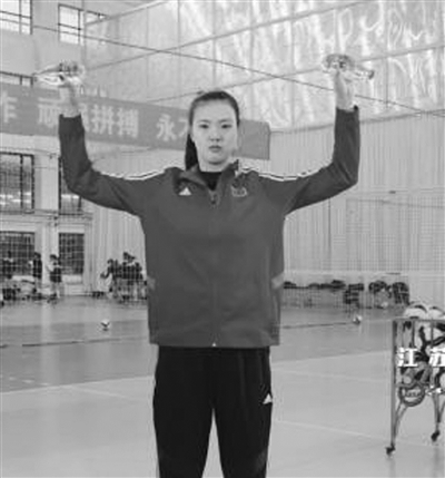 ●兩臂伸直,雙手虎口相對(duì),掌心向后握持重物(礦泉水瓶)放在身體兩側(cè);