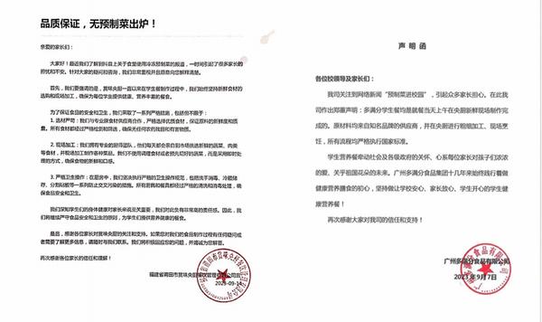 目前,還有多家餐飲公司回應。9月7日,廣州多滿分食品有限公司發(fā)聲明稱,學生餐均是就餐當天上午在央廚新鮮現(xiàn)場制作完成的。