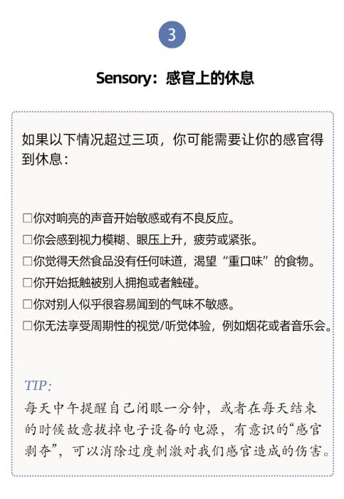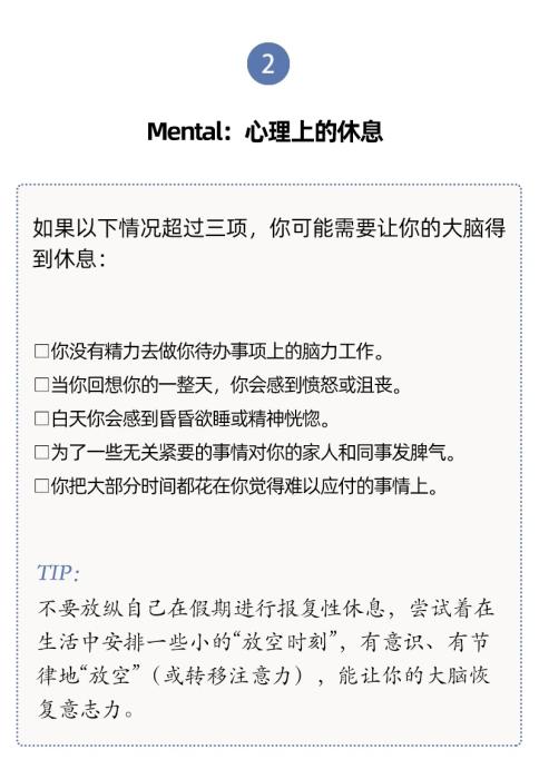 人們對于休息有不同層面的需要,休息與每一天的生活息息相關(guān)。單靠某一個具體的假期、某一種具體的活動(社交或者睡覺),并不能讓我們恢復(fù)到完全休息好了的狀態(tài)。