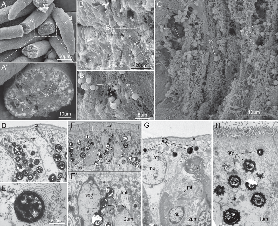 通過顯微鏡觀察,科學家發(fā)現(xiàn)蠕蟲的上皮細胞中充滿了直徑0.77-1.29微米的黃色顆粒。這些顆粒不僅存在于體表,還分布在鰓、口觸手和消化道中——所有與海水直接接觸的部位。
