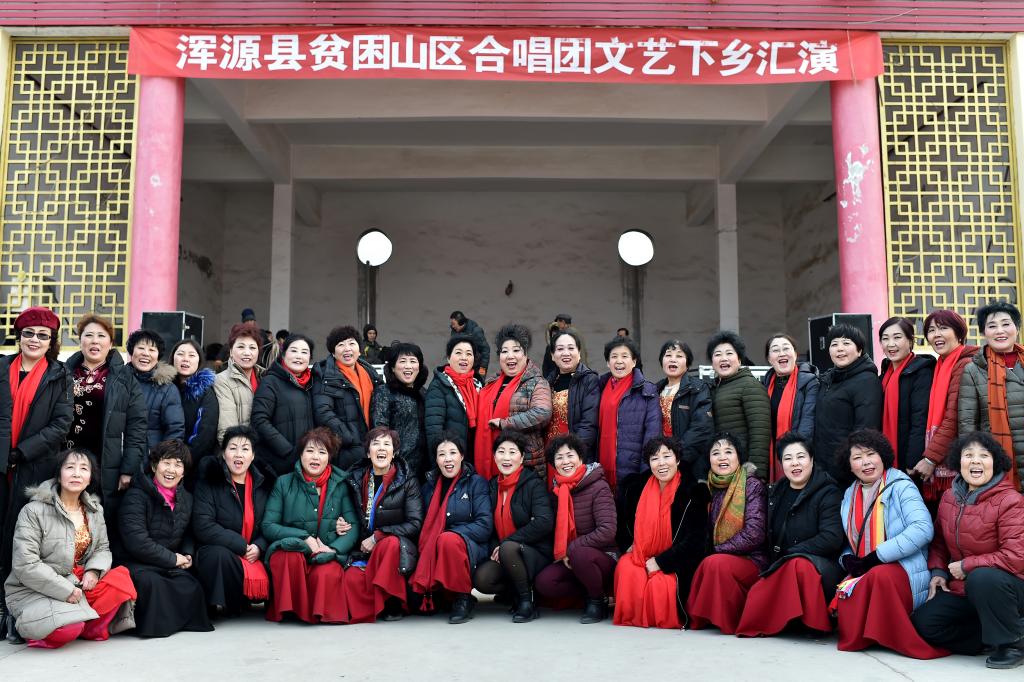 ↑1月3日,在山西省渾源縣荊莊村,渾源縣貧困山區(qū)合唱團(tuán)在表演合唱《紅梅贊》。
