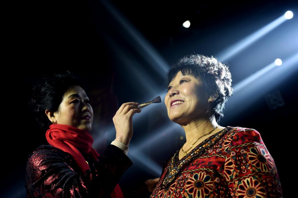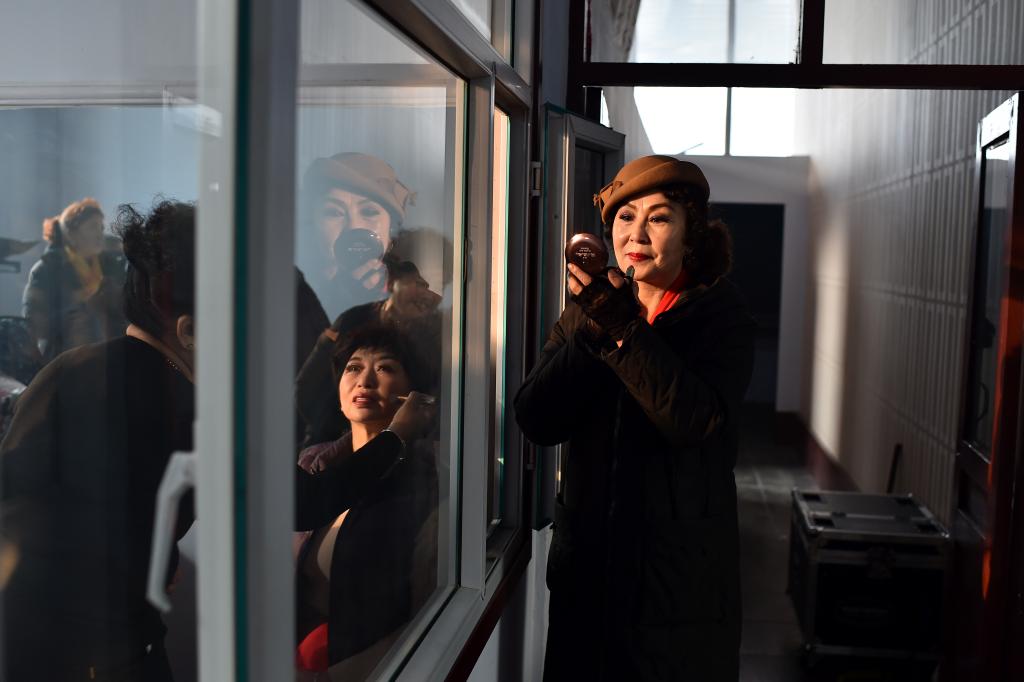 ↑1月3日,在山西省渾源縣貧困山區(qū)合唱團(tuán),一名團(tuán)員在舞臺(tái)邊化妝。