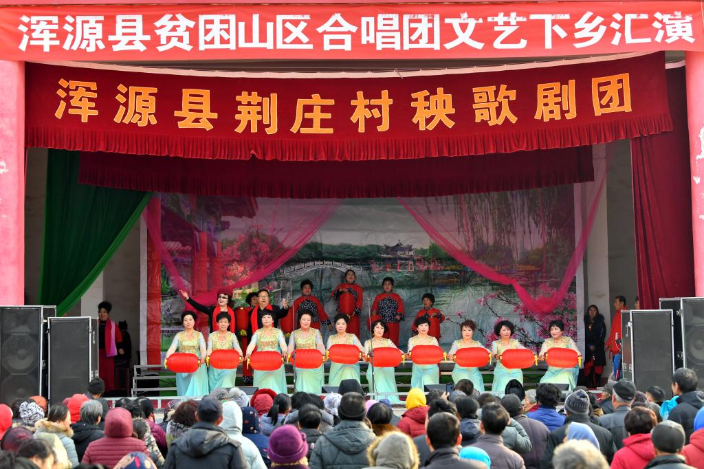 ↑1月3日,在山西省渾源縣荊莊村,渾源縣貧困山區(qū)合唱團(tuán)在表演歌舞《看山看水看中國(guó)》。