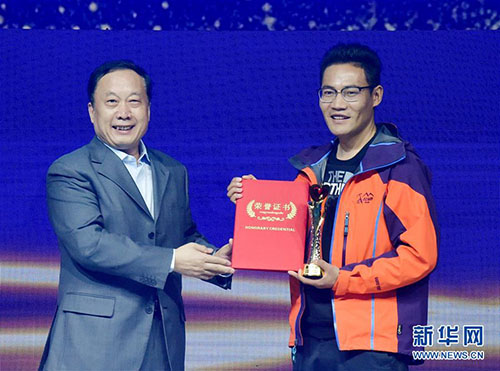 1月18日,“環(huán)保衛(wèi)士”次仁旦達(右)上臺領(lǐng)獎。 當日,新華社主辦的“中國網(wǎng)事·感動2018”年度頒獎典禮在中國傳媒大學(xué)舉行,10位“草根”成為舞臺上最閃亮的明星。新華社記者 李賀 攝
