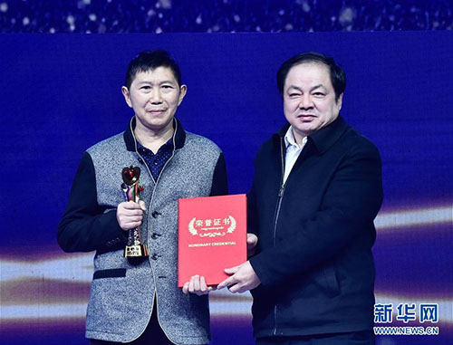 1月18日,“粉筆畫老師”張舉文(左)上臺領(lǐng)獎。當日,新華社主辦的“中國網(wǎng)事·感動2018”年度頒獎典禮在中國傳媒大學(xué)舉行,10位“草根”成為舞臺上最閃亮的明星。新華社記者 李賀 攝