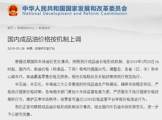 人民網(wǎng)北京3月28日電 (王紹紹) 國家發(fā)改委剛剛發(fā)布通知, 根據(jù)近期國際市場油價變化情況,按照現(xiàn)行成品油價格形成機制,自2019年3月28日24時起,國內(nèi)汽、柴油價格(標(biāo)準(zhǔn)品,下同)每噸均提高80元。調(diào)整后,各?。▍^(qū)、市)和中心城市汽、柴油最高零售價格見附表。相關(guān)價格聯(lián)動及補貼政策按現(xiàn)行規(guī)定執(zhí)行。