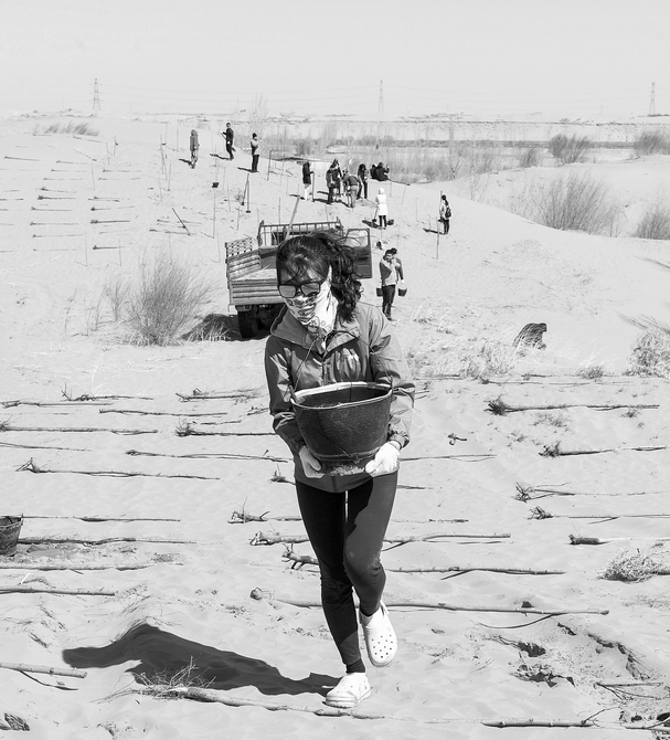 3月31日,一名青年志愿者正在取水澆灌。當(dāng)日,200余名中韓兩國(guó)青年志愿者來(lái)到內(nèi)蒙古自治區(qū)達(dá)拉特旗庫(kù)布其沙漠種樹(shù)。2006年起,中國(guó)國(guó)際青年交流中心與韓國(guó)韓中文化青少年協(xié)會(huì)組織兩國(guó)青年志愿者在庫(kù)布其沙漠植樹(shù),參與防沙固沙項(xiàng)目。截至目前已植樹(shù)850多萬(wàn)株,造林3萬(wàn)多畝。新華社記者劉磊攝 (責(zé)任編輯:盧相?。?/p> |