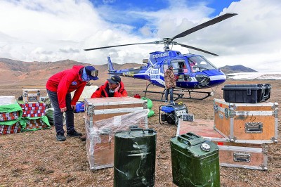科考團隊用直升機將科考物資運往海拔6100米的冰原,以進行冰芯鉆取工作。新華社發(fā)