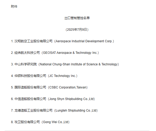商務(wù)部公告2025年第35號 公布將8家臺灣地區(qū)實(shí)體列入出口管制管控名單