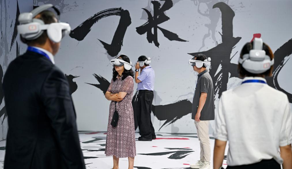 7月4日,2025上海合作組織國(guó)家電影節(jié)電影市場(chǎng)開(kāi)幕式及電影科技成果展覽啟動(dòng)活動(dòng)在重慶永川國(guó)際會(huì)展中心舉行,嘉賓觀看中國(guó)電影科技企業(yè)的虛擬影片。新華社記者 陳誠(chéng) 攝
