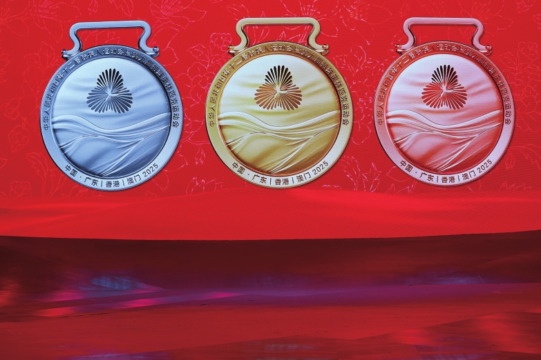 殘?zhí)貖W會獎牌“同心暖”也揭開面紗。獎牌頂端掛鉤采用嶺南特色“鑊耳屋”造型,獎牌正面鐫刻會徽和連綿海浪紋,背面以港珠澳大橋為背景,吉祥物中華白海豚浮雕高擎火炬,并附有盲文,讓視障運動員能夠親手觸摸這份榮耀。