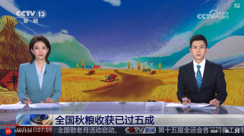 央視網(wǎng)消息:據(jù)農(nóng)業(yè)農(nóng)村部最新消息,截至10月10日,全國(guó)秋糧收獲已過(guò)五成。分作物看,中稻收獲近六成,玉米過(guò)五成,大豆五成半,雙季晚稻零星收獲。