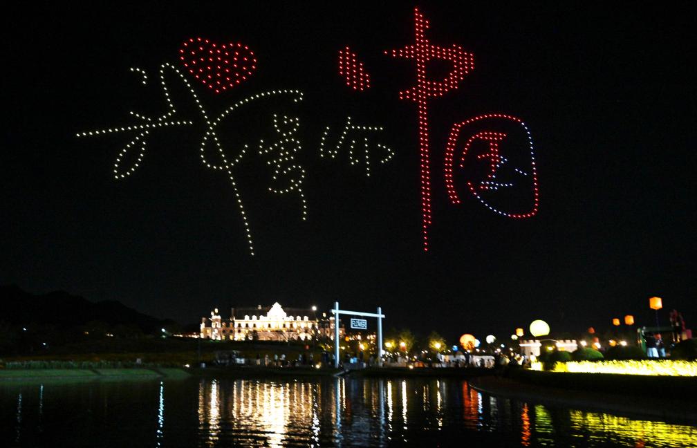 10月4日晚,在浙江省金華市武義縣花田美地景區(qū),精彩的無人機(jī)表演為游客呈現(xiàn)了一場視覺盛宴。新華社發(fā)(張建成攝)