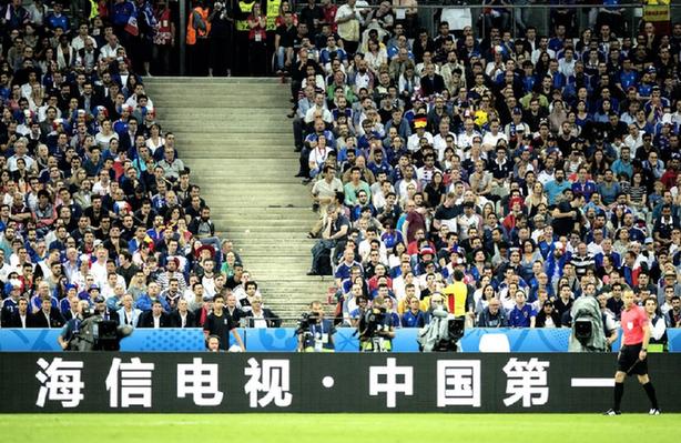 “海信電視,中國(guó)第一”!2016年6月10日,法國(guó)巴黎圣丹尼斯球場(chǎng),隨著歐洲杯揭幕戰(zhàn)打響,中國(guó)品牌海信的廣告出現(xiàn)在全球球迷面前。這是歐洲杯56年來第一次迎來中國(guó)贊助商,海信的廣告也在未來1個(gè)月內(nèi)出現(xiàn)在全部51場(chǎng)歐洲杯比賽中。