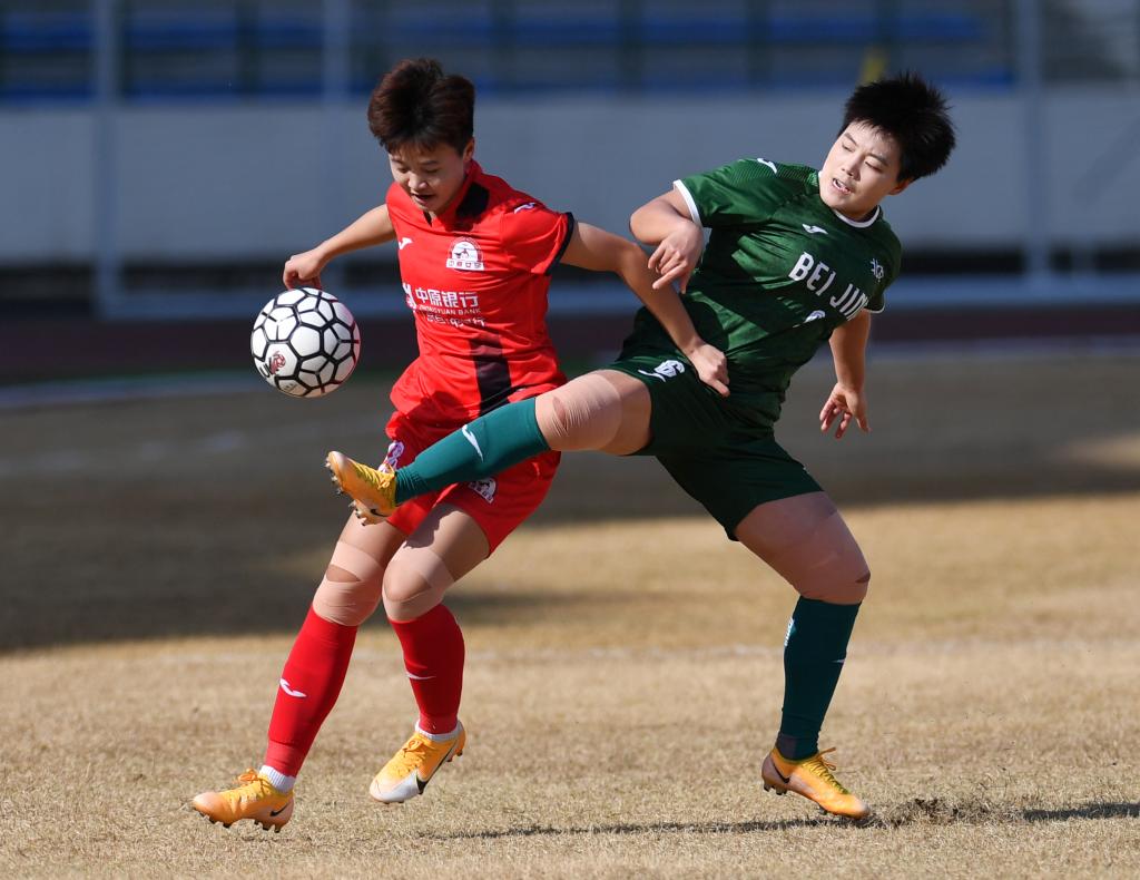 3月4日,北京女足隊(duì)球員馬曉蘭(右)與河南中原女足隊(duì)球員樊夢(mèng)霏在比賽中拼搶。新華社記者 李嘉南 攝
