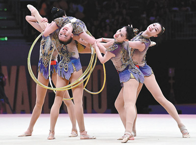 中國藝術體操隊的良好狀態(tài)延續(xù)到最后一個比賽日。在5圈單項決賽中,率先登場的中國隊高質(zhì)量地完成整套動作,以36.550分獲得金牌,為中國藝術體操隊贏得首個世界冠軍。在隨后進行的3帶2球單項決賽中,中國隊依舊發(fā)揮亮眼,以32.800分收獲一枚銀牌。