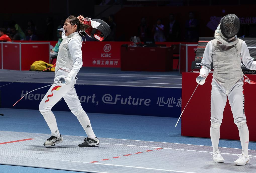 開局互相試探后,東晟良率先發(fā)起進(jìn)攻,被黃芊芊化解。在令人窒息的緊張氛圍中,兩人幾乎同時(shí)出手,黃芊芊刺中對(duì)手右肩,亮燈得分,她一把摘下面罩,怒吼慶祝。
