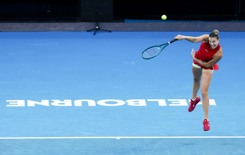 1月17日,薩巴倫卡在比賽中發(fā)球。新華社記者 馬平 攝