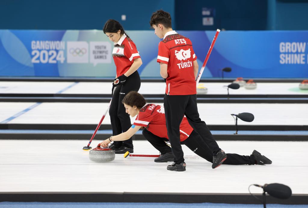 1月20日,土耳其隊隊員在冰壺混合團體項目的比賽中。新華社記者 胡虎虎 攝
