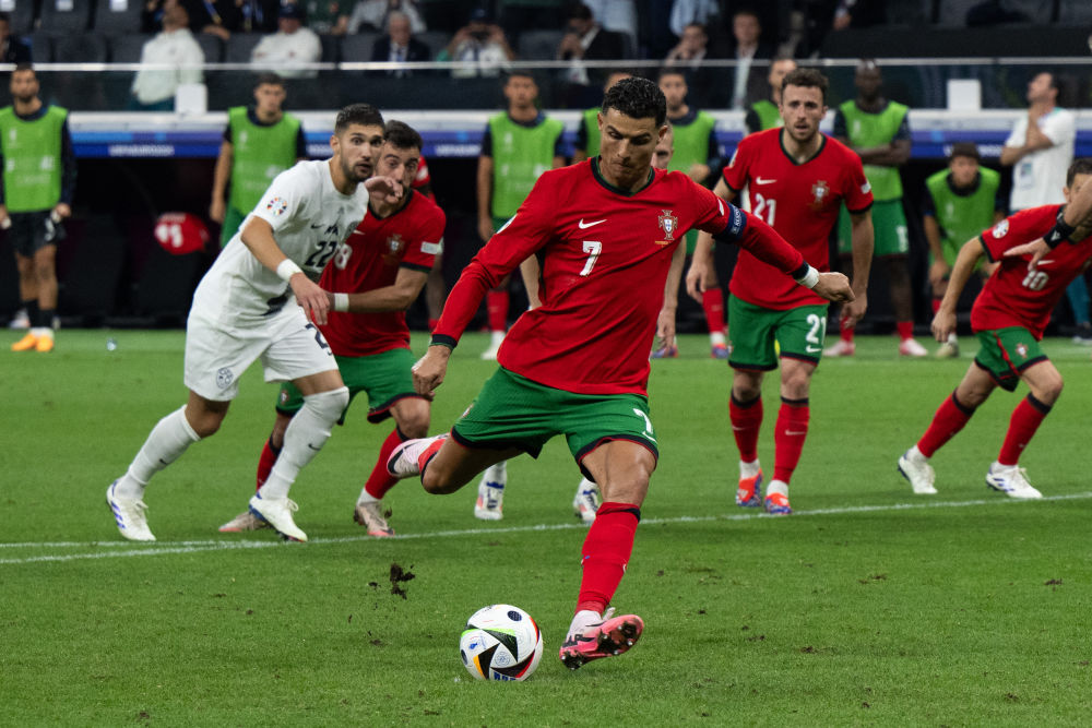 雙方在常規(guī)時(shí)間內(nèi)都沒能攻破對(duì)方大門,但C羅原本有機(jī)會(huì)在加時(shí)賽中打進(jìn)致勝進(jìn)球,但他在加時(shí)賽上半場(chǎng)的點(diǎn)球被對(duì)方門將奧布拉克撲出。失點(diǎn)后的C羅傷心流淚,隊(duì)友及教練團(tuán)隊(duì)紛紛上前安慰,現(xiàn)場(chǎng)的葡萄牙球迷也大喊著“Viva Ronaldo”為這位已經(jīng)39歲的老將打氣。