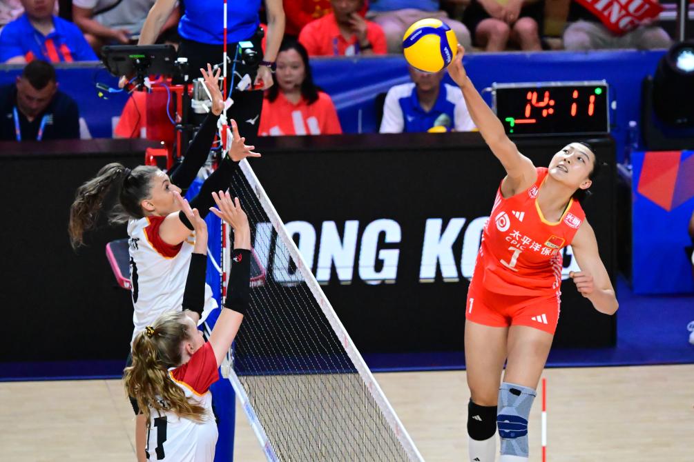 6月14日,中國隊球員袁心玥(右)在比賽中扣球。當日,在世界女排聯(lián)賽中國香港站比賽中,中國隊3比0戰(zhàn)勝德國隊。新華社記者 朱煒 攝