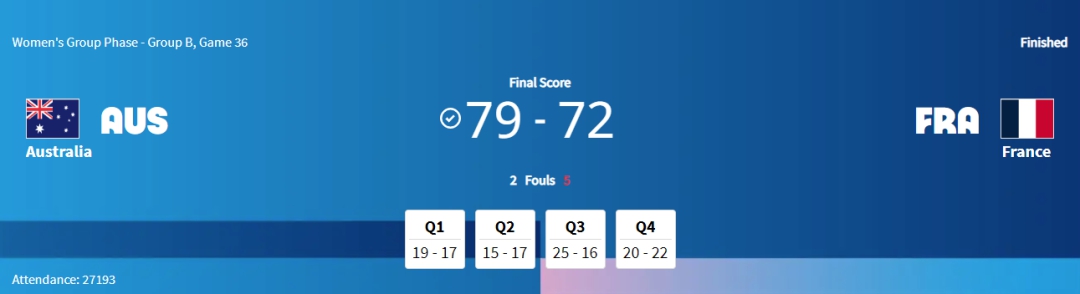 中新網(wǎng)北京8月5日電(記者 劉星晨)北京時(shí)間5日凌晨,巴黎奧運(yùn)會(huì)女籃小組賽全部結(jié)束。在最后一場(chǎng)比賽中,澳大利亞女籃79:72戰(zhàn)勝東道主法國(guó)女籃。本場(chǎng)取勝后,澳大利亞女籃以2勝1負(fù)的戰(zhàn)績(jī)出線。