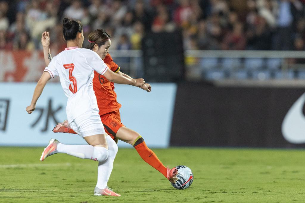 10月29日,中國隊(duì)球員張馨(右)在比賽中射門。新華社記者 黃偉 攝 下半場越南隊(duì)逐漸找到狀態(tài),發(fā)起了多次有威脅的進(jìn)攻。然而雙方拼搶到補(bǔ)時(shí)階段,越南隊(duì)陳氏秋草解圍不慎,踢入一記“烏龍球”,比分最后鎖定在2:0。