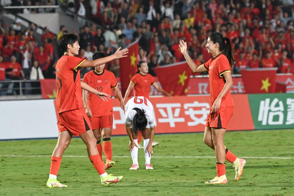 10月29日,中國隊(duì)球員袁叢(前左)和王妍雯(前右)慶祝進(jìn)球。新華社記者 張子彧 攝 賽后,中國隊(duì)主教練安特·米利西奇表示,他對(duì)球員們上半場的表現(xiàn)感到滿意,但下半場一度失去掌控權(quán),這與本場比賽距離上一場比賽間隔較短有關(guān)。 (責(zé)任編輯:蔡文斌) |