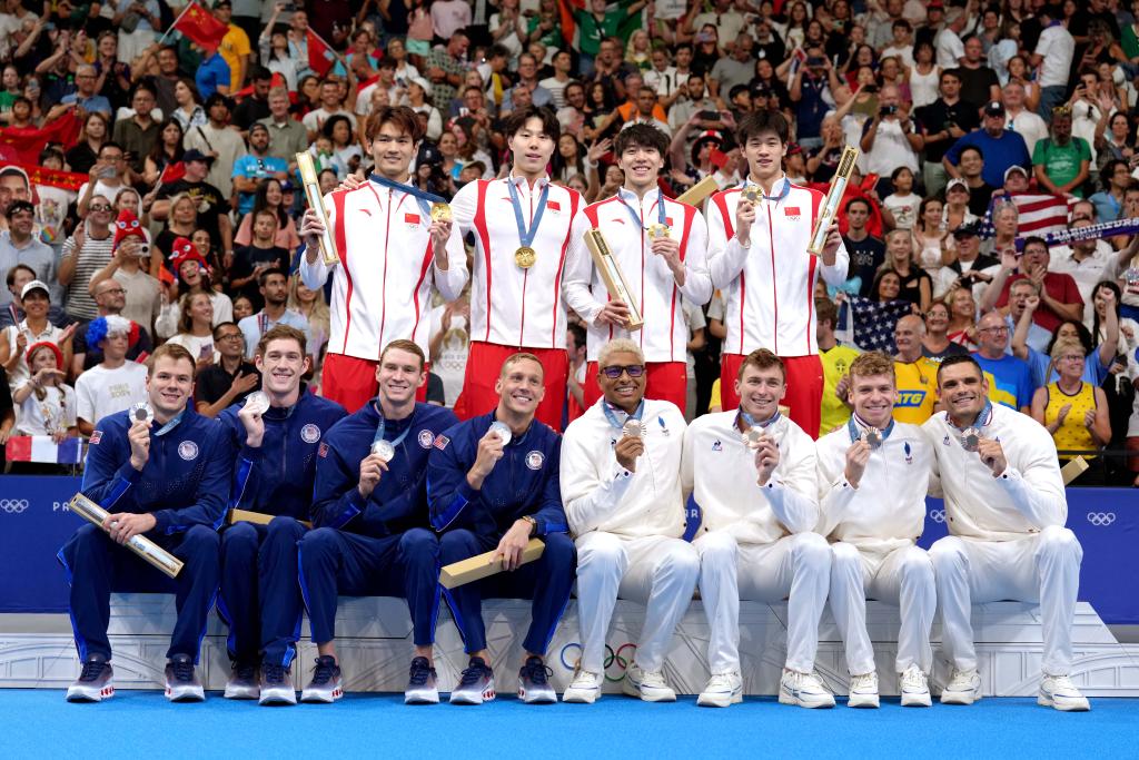 8月4日,冠軍中國隊(duì)(上)、亞軍美國隊(duì)(下左)、季軍法國隊(duì)在巴黎奧運(yùn)會游泳項(xiàng)目男子4x100米混合泳接力頒獎(jiǎng)儀式上。新華社記者 杜宇 攝