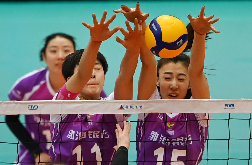 2月25日,天津隊球員陳博雅、王媛媛(右)在比賽中攔網(wǎng)。新華社記者 趙子碩 攝