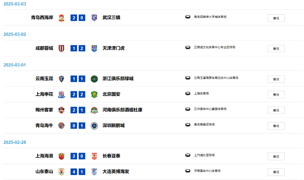 圖為2025賽季中超聯(lián)賽第二輪賽果。圖片來自中國足球職業(yè)聯(lián)賽聯(lián)合會官網(wǎng) 1日在申花隊主場進行的“京滬德比”涌入近4萬名觀眾。林良銘在第11分鐘頭球破門,幫助國安隊取得領(lǐng)先。第38分鐘,吳曦禁區(qū)內(nèi)吊射破門,為主隊扳平比分。上半場補時階段,國安隊門將韓佳奇出擊打到蔣圣龍面部,申花隊獲得點球,路易斯主罰命中。 第82分鐘,張源累計兩張黃牌被罰下場。少一人作戰(zhàn)的國安隊展現(xiàn)出頑強斗志,法比奧在補時階段頭球造成對手的“烏龍球”,這場強強對話最終以2:2平局結(jié)束。 本場比賽中,近日首次入選中國男足成年國家隊的劉誠宇替補登場,完成中超首秀。連續(xù)迎來重要里程碑,這位18歲申花小將表示:“我的信心會好一點。要向老大哥們學(xué)習(xí),一場場爭取越來越好?!?/p>