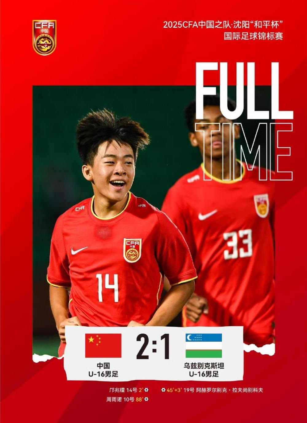 上半場雙方各打進(jìn)一粒進(jìn)球。開場僅兩分鐘,何思凡左路傳中,鄺兆鐳跟上破門,幫助中國隊(duì)以1:0領(lǐng)先對手。隨后,中國隊(duì)險(xiǎn)些擴(kuò)大分差,王非尼亞突破造成點(diǎn)球并由自己主罰,一腳“勺子”點(diǎn)球因角度不佳被對方門將撲出。上半場傷停補(bǔ)時(shí)階段,沉寂許久的烏茲別克斯坦隊(duì)抓住機(jī)會,拉夫尚別科夫接住隊(duì)友的斜吊傳中,頭球攻門扳平比分。易邊再戰(zhàn),雙方拼搶激烈,多次在對方禁區(qū)制造威脅,但都差“臨門一腳”。直到第88分鐘,中國隊(duì)?wèi){借角球獲得二次進(jìn)攻機(jī)會,周雨諾“一劍封喉”,以一腳遠(yuǎn)射破門鎖定勝局。加上此前和日本隊(duì)?wèi)?zhàn)平,中國隊(duì)以一勝一平暫居積分榜次席。