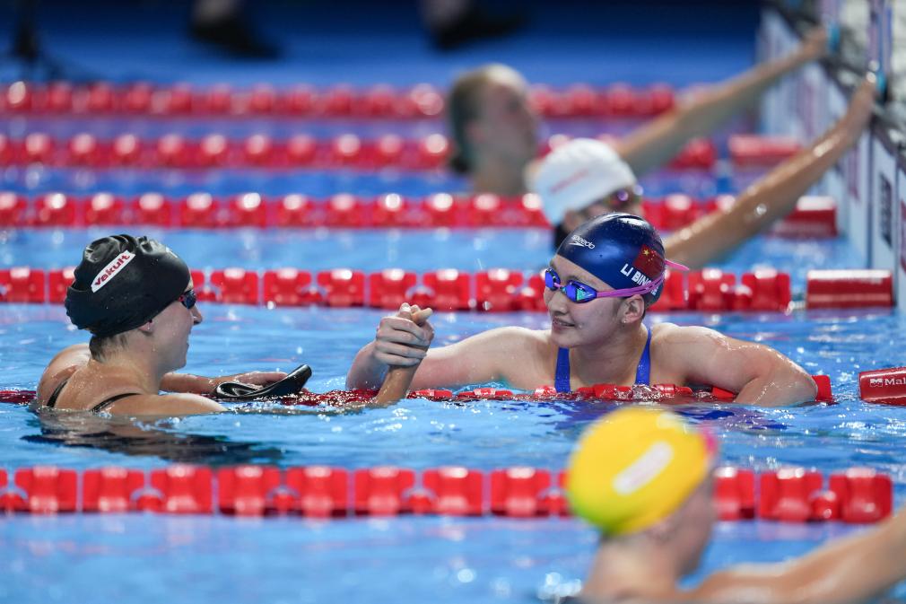 同為中長(zhǎng)距離自由泳女將,對(duì)23歲的李冰潔來(lái)說(shuō),28歲的萊德茨基是她一直以來(lái)的榜樣和對(duì)手?!八俏覐男【拖氤降娜??!崩畋鶟嵳f(shuō),“我記得2017年時(shí)我就說(shuō)過(guò)想超越她,她一直以來(lái)在我心里都是一個(gè)非常偉大的運(yùn)動(dòng)員,我也從她身上學(xué)到了很多東西,今天戰(zhàn)勝了她,我感到非常感慨,感覺(jué)(戰(zhàn)勝萊德茨基)這么多年來(lái)是我心里的一個(gè)掛念。”