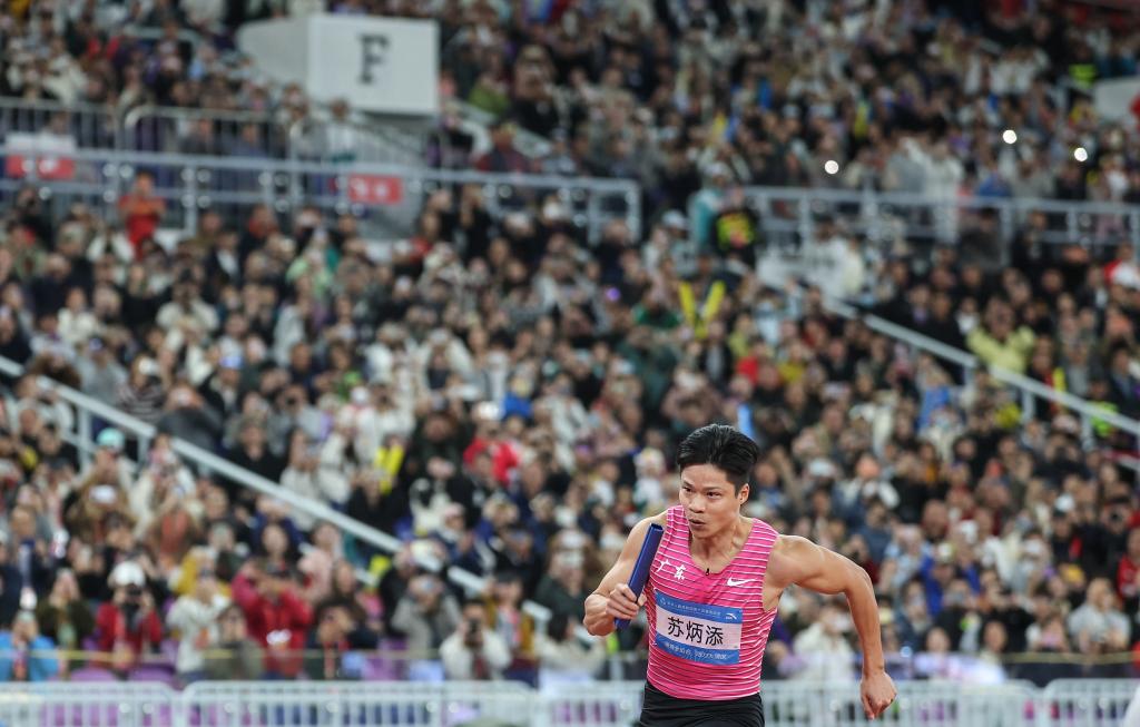 當日,田徑項目依然是金牌大戶,共產(chǎn)生12枚金牌。36歲的男子100米亞洲紀錄保持者蘇炳添成為全場焦點,他在家門口的賽道上跑完了職業(yè)生涯的最后100米,帶領(lǐng)一眾“00后”隊友為廣東隊奪得男子4×100米接力第四名。盡管未能幫助家鄉(xiāng)隊伍站上領(lǐng)獎臺,但蘇炳添仍贏得了滿場掌聲。