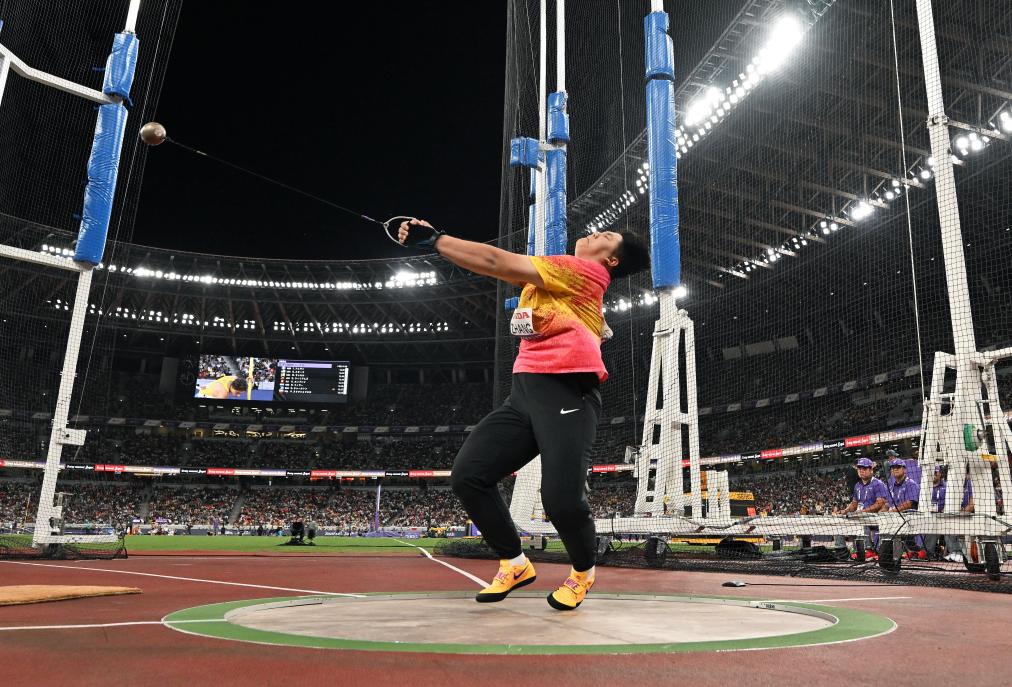9月15日,2025年世界田徑錦標(biāo)賽女子鏈球決賽在日本東京舉行,圖為中國(guó)選手張家樂在比賽中試投。新華社記者 宋彥樺 攝