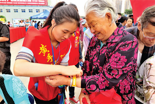 參與活動(dòng)的愛心志愿者通過豐富多彩的文藝節(jié)目,宣傳黃手環(huán)的正確使用方法,還向廣大市民講解有關(guān)老年人的護(hù)理知識(shí)和一些急救常識(shí),相關(guān)醫(yī)療機(jī)構(gòu)派出專業(yè)人員在現(xiàn)場開展了義診活動(dòng),市老齡辦對本次慈善公益活動(dòng)給予了大力支持。圖為志愿者在為一位老人戴上黃手環(huán)。(魯明強(qiáng) 攝影報(bào)道)