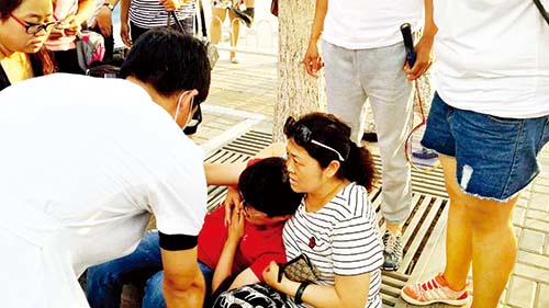 在等待救護(hù)車到來的時(shí)候,一位路過的老人遞過幾粒隨身攜帶的速效救心丸,劉增芬馬上將藥往男青年嘴里喂,卻怎么也喂不進(jìn)去。這時(shí),呂卓蔚也從藥店買來了速效救心藥品,劉增芬勸男青年張開嘴吃藥:“孩子,這是救命藥,快張開嘴啊?!碑惓M纯嗟哪星嗄暝诔詭状巍⒌魩状沃?,終于含服了幾粒藥。