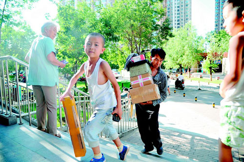 “您好!快遞來了,請下樓接收您的快遞……”這是一位很特別的“快遞小哥”,他叫王志偉,今年7歲。他的爸爸是一名快遞員,名叫王貴生,今年49歲,山西靜樂人,右臂殘疾。暑假來了,為了能和爸爸在一起,小志偉就跟著爸爸每天穿梭在城市的大街小巷。爸爸負責拆件、分揀,兒子負責打電話通知客戶。