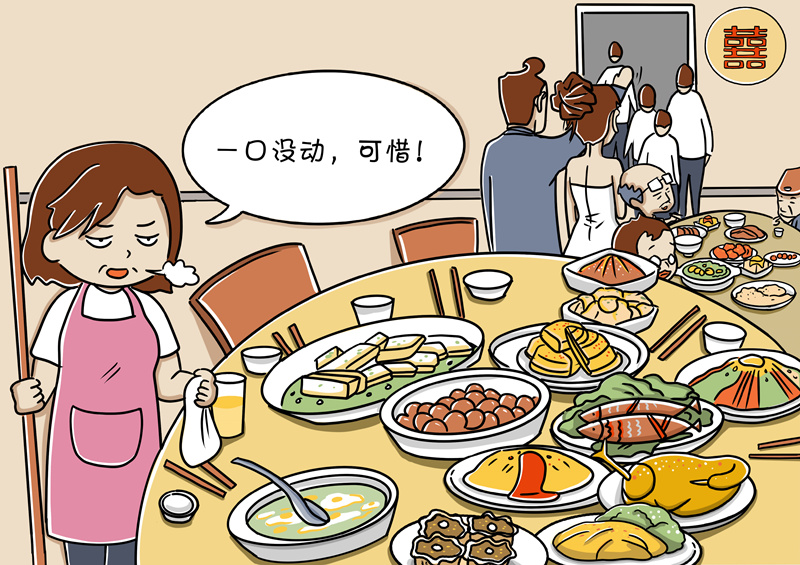 杜絕“剩宴”需要社會合力。結(jié)婚“剩宴”并不是短時間形成的,也不是個別現(xiàn)象,因此,根治這種陋習(xí)、在全社會培養(yǎng)節(jié)約意識和節(jié)儉習(xí)慣是一項長期任務(wù),也是一項全民行動,需要社會各界多元化、多角度共同推進(jìn)。比如,黨員干部以身作則,率先垂范;餐飲行業(yè)增強(qiáng)節(jié)約意識,改進(jìn)服務(wù),合理優(yōu)化供應(yīng)標(biāo)準(zhǔn)。只有人人轉(zhuǎn)變觀念,共同做厲行節(jié)約、反對浪費(fèi)的踐行者、宣傳者和監(jiān)督者,才能帶動形成良好社會風(fēng)氣。(文字:馬若虎 漫畫:甘甜)