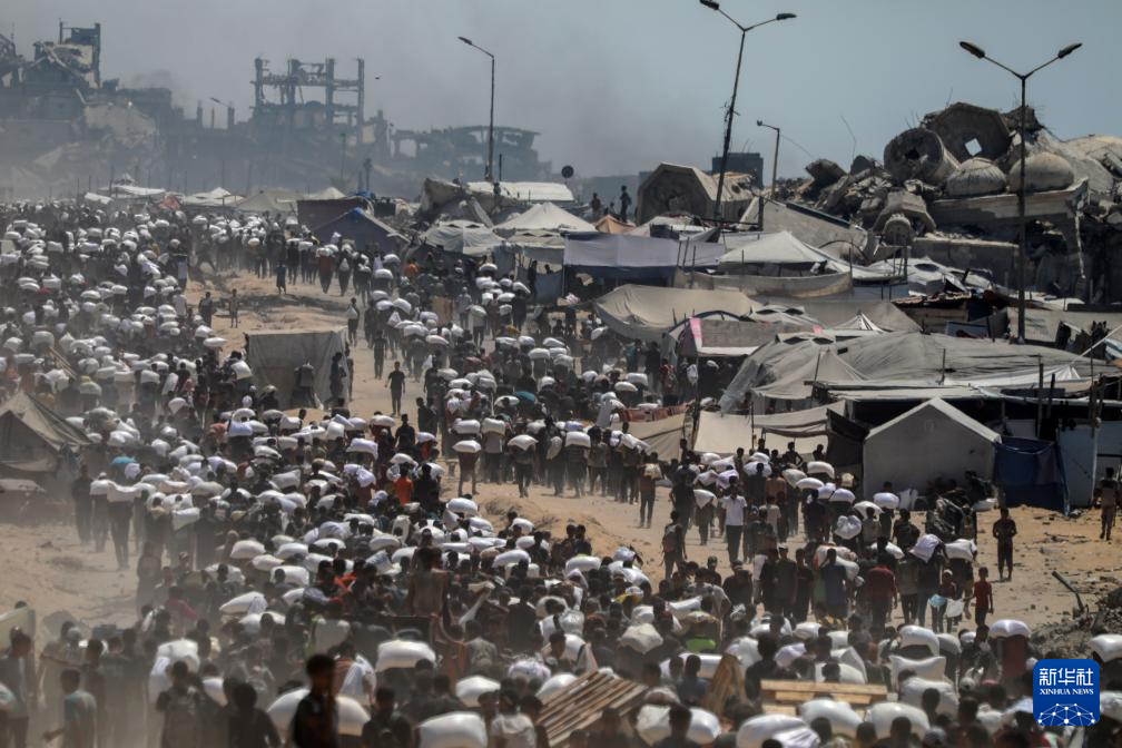 7月27日,在加沙地帶北部城鎮(zhèn)拜特拉希亞,人們領(lǐng)取通過(guò)邊境口岸進(jìn)入加沙的援助物資。新華社發(fā)(里澤克·阿卜杜勒賈瓦德攝)