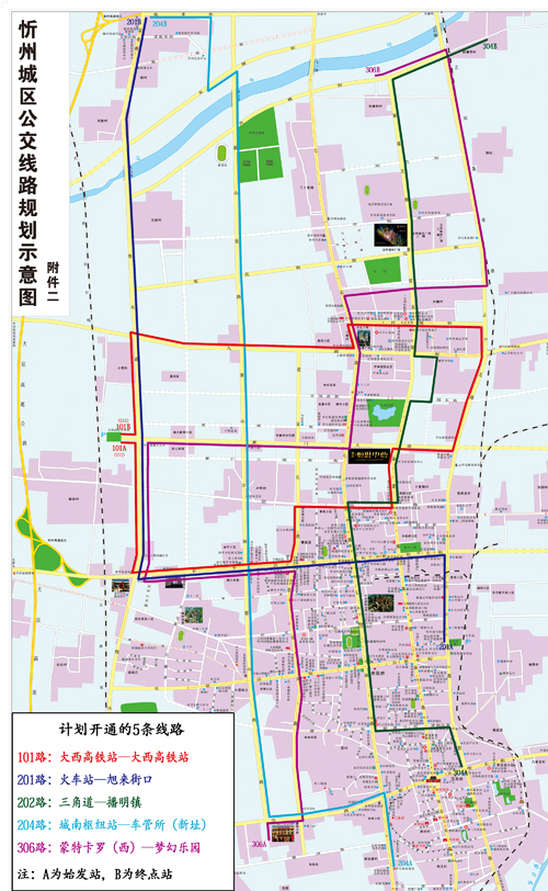 忻州公共交通有限公司自去年九月運(yùn)營以來,受到廣大市民的關(guān)注和好評(píng)。為更好地給忻州城區(qū)市民提供安全、方便、快捷、舒適的乘車環(huán)境,根據(jù)忻州城區(qū)公交線路實(shí)際情況,在優(yōu)化、完善現(xiàn)運(yùn)營7條公交線路的基礎(chǔ)上,擬再開通5條公交線路,現(xiàn)將各公交線路有關(guān)情況進(jìn)行公示,望廣大市民周知。 公示日期:5月10日——5月14日 征求意見郵箱:chengshikeyun@126.com 忻州市交通運(yùn)輸局 公交線路編號(hào)為:“1”字頭為環(huán)線,“2”字頭為干線,“3”字頭為區(qū)間線。運(yùn)行線路共12條,其中環(huán)線2條、干線4條、區(qū)間線6條。基本情況列下: 一、101路(環(huán)線,招標(biāo)文件中線路序號(hào)101路),大西高鐵站— 大西高鐵站,早班發(fā)車7:00,末班發(fā)車19:40。單程15.1KM,計(jì)劃投放銀隆牌公交車20輛,車輛運(yùn)行間隔時(shí)間為6分鐘。 途經(jīng)站點(diǎn):大西高鐵站→客運(yùn)總站→十一中→供水大廈→公路局→榮軍醫(yī)院→溫馨苑小區(qū)→區(qū)法院→欣秀苑→桃園新村→公交總站→云中花園→汾源街口→忻州二中→開發(fā)區(qū)管理處→市電業(yè)局→小檀村口→惠民小區(qū)→小奇村→大西高鐵站,共19個(gè)站點(diǎn)。 二、102路(環(huán)線,原103路),客運(yùn)總站—客運(yùn)總站,早班發(fā)車7:00,末班發(fā)車19:40。單程16.8KM,投放銀隆牌公交車20輛,車輛運(yùn)行間隔時(shí)間為6分鐘。 途經(jīng)站點(diǎn):客運(yùn)總站(南)→十中→保安公司→鐵合金廠→十七局宿舍→十七局→長征街路口→新紡宿舍→健康小區(qū)→健康路小學(xué)→市人民醫(yī)院→北方中學(xué)→批發(fā)市場→醫(yī)藥公司→火車站→云中路小學(xué)→和平廣場→市委宿舍→五臺(tái)山大酒店→欣秀苑小區(qū)→人民公園東門→人民公園北門→世紀(jì)花苑→人民醫(yī)院→盧野路口→民心家園→客運(yùn)總站(北),共27個(gè)站點(diǎn)。 三、201路(干線,原招標(biāo)文件中線路序號(hào)201路)火車站—旭來街口,早班發(fā)車7:00,末班發(fā)車19:40。單程14.0KM,計(jì)劃投放銀隆牌公交車10輛,車輛運(yùn)行間隔時(shí)間為8分鐘。 途經(jīng)站點(diǎn):火車站→云中路小學(xué)→和平廣場→市人民銀行→忻州師院→建設(shè)路口→忻州市供水公司→客運(yùn)中心→解原村口→大西高鐵站→小奇村口→北趙村口→河拱村→頓村→旭來街口,共15個(gè)站點(diǎn); 四、202路(干線,原招標(biāo)文件中線路序號(hào)304路)三角道—播明鎮(zhèn),早班發(fā)車7:00,末班發(fā)車19:40。單程11KM,計(jì)劃投放中通牌公交車16輛,車輛運(yùn)行間隔時(shí)間為6分鐘。 途經(jīng)站點(diǎn):三角道→小商品批發(fā)市場→北方中學(xué)→實(shí)驗(yàn)二小→日月廣場→華美超市(利民街店)→忻州市工會(huì)→圖書大廈→華美超市(團(tuán)結(jié)路店)→區(qū)法院→欣秀苑小區(qū)→人民公園東門→播明中學(xué)→郵局→日月宏小區(qū)→職業(yè)技術(shù)學(xué)院→新建路開元街口→西播明村口→水上公園→播明鎮(zhèn),共19個(gè)站點(diǎn)。 五、203路(干線,原107路),新世紀(jì)小區(qū)—頓村(清華小學(xué)),早班發(fā)車6:50,末班發(fā)車19:40。單程16.0KM,投放青年牌公交車28輛,車輛運(yùn)行間隔時(shí)間為5分鐘。 途經(jīng)站點(diǎn):新世紀(jì)小區(qū)→中心醫(yī)院→忻府區(qū)人民政府→北城門樓→交警大隊(duì)→忻府區(qū)衛(wèi)生局→忻州市財(cái)政局→健康路口→實(shí)驗(yàn)二小→日月廣場→華美超市利民街店→忻州市工會(huì)→圖書大廈→華美超市團(tuán)街店→師院附中→市交通局→市公安局→市公路段→開發(fā)區(qū)→小檀村北口→鼎昌大廈→技術(shù)學(xué)院→二十里鋪村口→二十里鋪新區(qū)→水上公園→頓村路口→會(huì)議中心→消防培訓(xùn)中心→頓村(清華小學(xué)),共29個(gè)站點(diǎn)。 六、204路(干線,原招標(biāo)文件中線路序號(hào)202路)城南樞紐站—交警考訓(xùn)車管所,早班發(fā)車7:00,末班發(fā)車19:40。單程16.5KM,計(jì)劃投放銀隆牌公交車18輛,車輛運(yùn)行間隔時(shí)間為6分鐘。 途經(jīng)站點(diǎn)為:城南樞紐站→飛虹橋→吉祥小區(qū)→加汽站→蒙特卡羅→慕山路光明街口→招呼站→慕山路健康街口→慕山路長征街口→慕山路利民街口→慕山路氣象北巷→和平小區(qū)→慕山路學(xué)府街口→慕山路團(tuán)結(jié)街口→慕山路雁門大道口→慕山路公園街口→慕山路九源街口→慕山路梨花街口→招呼站→五館一院→云中河公園→忻一中(北校區(qū))→通崗路北橫三道街→同煤會(huì)議中心→消防中心→交警考訓(xùn)車管所,共26個(gè)站點(diǎn)。 七、301路(區(qū)間線,原101路)解原鄉(xiāng)政府—客運(yùn)總站,早班發(fā)車7:00,末班發(fā)車19:40。單程13.5KM,投放青年牌公交車20輛,車輛運(yùn)行間隔時(shí)間為6分鐘。 途經(jīng)站點(diǎn):解原鄉(xiāng)政府→佐城村口→流江村口→新路村口→供熱公司→燕山加油站→田家炳中學(xué)→逯家莊村口→武警支隊(duì)→寧靜大廈→廣電大樓→忻州六中→日月廣場→忻州市人民政府→君華新天地購物廣場→洗滌化妝品→火車站→云中路小學(xué)→和平廣場→市人民銀行→忻州師院→建設(shè)路口→忻州市