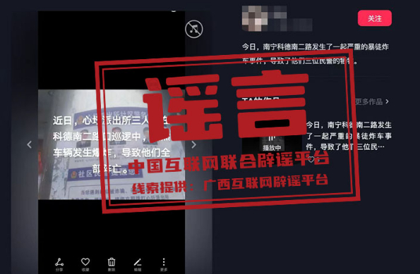 真相:近期,有網(wǎng)民在短視頻平臺上發(fā)布視頻稱“某派出所三人在路口巡邏中,突然車輛發(fā)生爆炸,導致三位民警全部犧牲”。經(jīng)南寧公安部門調(diào)查,該信息為謠言。網(wǎng)民韋某為吸引關(guān)注,杜撰此條謠言信息,并利用手機進行發(fā)布。根據(jù)《中華人民共和國治安管理處罰法》第二十五條,屬地公安機關(guān)已依法對韋某處以行政處罰。(來源:廣西互聯(lián)網(wǎng)辟謠平臺、南寧網(wǎng)警)