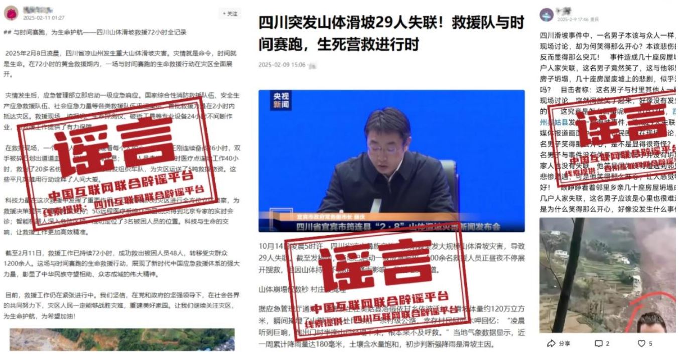 2月9日,有網民在某網絡平臺發(fā)布題為《30人被埋!四川山體崩塌瞬間曝光,行車記錄儀拍下死神奪命10秒》的帖文。經核實,帖文配圖均為嫁接舊聞、圖文翻炒,網民將2024年8月茂縣山體滑坡救援現(xiàn)場、2016年12月宜賓市長寧縣下長鎮(zhèn)永利村一村民被推土機掩埋致死事件的舊聞重新拼接合成,編造為宜賓筠連山體滑坡最新動態(tài)后發(fā)布。(來源:四川互聯(lián)網舉報辟謠平臺、宜賓網警)