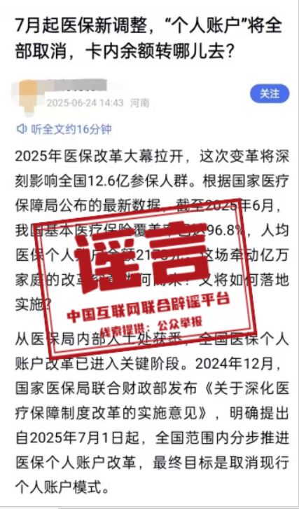 詳情:近日,一篇題為《7月起醫(yī)保新調(diào)整,“個(gè)人賬戶”將全部取消,卡內(nèi)余額轉(zhuǎn)哪里去?》的自媒體文章引起較多關(guān)注。文中宣稱“從醫(yī)保局內(nèi)部人士處獲悉,全國(guó)醫(yī)保個(gè)人賬戶改革已進(jìn)入關(guān)鍵階段”“自2025年7月1日起,全國(guó)范圍內(nèi)分步推進(jìn)醫(yī)保個(gè)人賬戶改革,最終目標(biāo)是取消現(xiàn)行個(gè)人賬戶模式”。